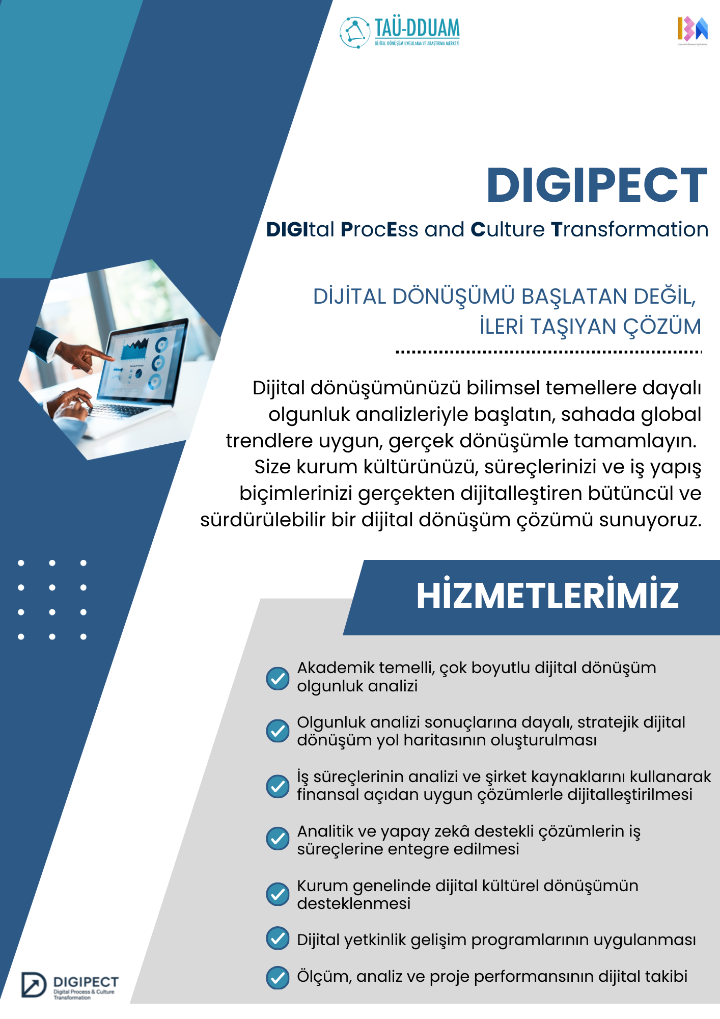 DIGIPECT YaklaşımıDIGIPECT modeli, dijital dönüşümü üç temel boyutta ele alır:Kültür: Kurumsal değerler, liderlik yaklaşımı, çalışanların dijital yetkinlikleri ve değişime açıklık düzeyi.Süreç: İş süreçlerinin dijitalleşme seviyesi, veri kullanımı, otomasyon olanakları ve teknolojik altyapı.İş Modeli: Değer yaratma biçimi, müşteri ilişkileri, finansal yapı ve iş ortaklıklarının dijital dönüşüme uyumu.Bu üç boyutun birlikte değerlendirilmesi sayesinde kurumların gerçek dönüşüm potansiyeli ortaya çıkarılır.